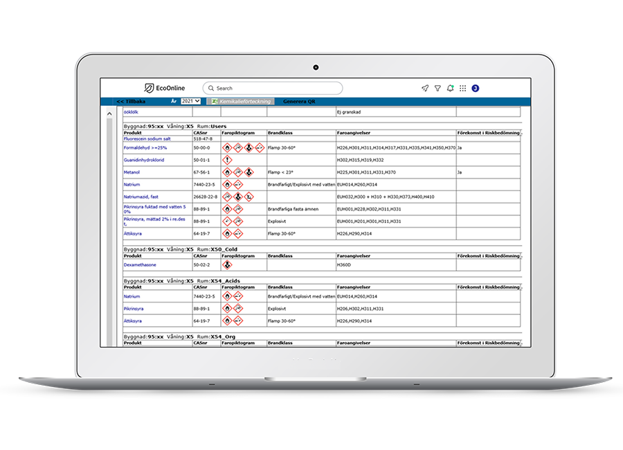 Möjlighet att söka på ingående ämnen utifrån de begränsningar som dessa ämnen har. T.ex. om organisationen har produkter med ingående komponenter som är CMR-klassade utan att det syns på produktens klassning. Möjlighet att söka fram produkter där de ingående ämnena omfattas av olika lagkrav inom miljö-, arbetsmiljö och brand.